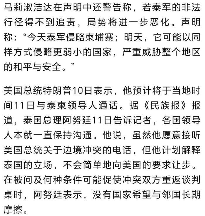 据柬埔寨《高棉时报》11日报道,柬国防部发言人马莉淑洁达当日发表声明称,这几日泰国军方犯下无数违反国际法的罪行,包括使用F-16战斗机轰炸平民区,使用毒气,摧毁柏威夏寺和塔克拉贝寺等历史遗址,杀害和伤害众多无辜平民等。
